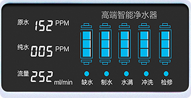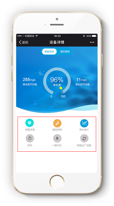 您可通过手机APP清楚查看家中自来水的水质情况,净化后水质数值、用水统计,水温状态等,您不需担心何时该换滤芯,它会在滤芯寿命即将到期时自动发送提醒,若机器漏水手机会发出响声一键关机,方便又省心。