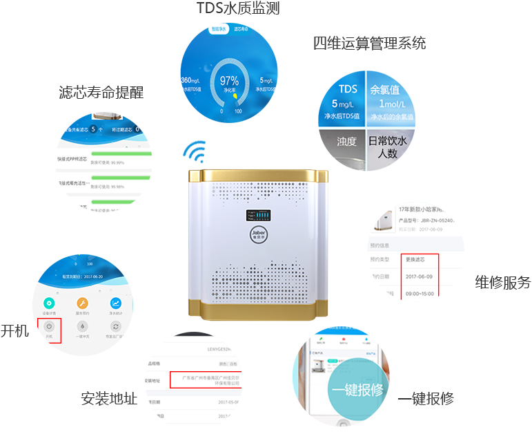 您可通过手机APP清楚查看家中自来水的水质情况,净化后水质数值、用水统计,水温状态等,您不需担心何时该换滤芯,它会在滤芯寿命即将到期时自动发送提醒,若机器漏水手机会发出响声一键关机,方便又省心。