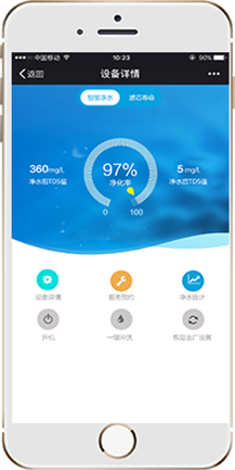 智能化净水设备安装有智能化提醒键及后台服务系统,能够明确显示出净化出的水的各项指标数据,如TDS值、滤芯生命周期 、漏水报警、原水缺水提醒……可以明明白白告诉使用者喝的是自己的水、是安全放心的水。用户通过手机APP, 自家净水器使用情况一目了然。一键报修 售后无忧 ,设备故障时,用户可以在软件APP中一键报修,客服人员通过后台即可看到报修信息并及时安排维护人员。用户甚至可以跟踪到每次维修人员的姓名、联系电话、维修时间等信息,并对维修服务进行评价。