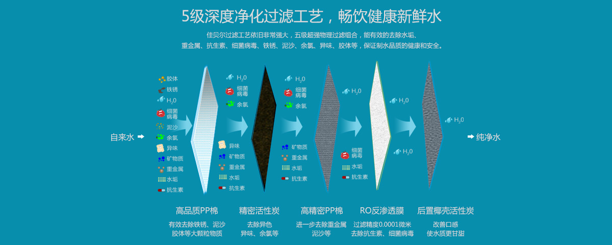 佳贝尔净水器滤芯构造健康生活:第一级PP棉(5微米)>第二级颗粒性活性炭>第三级PP棉(1微米)>第四级RO反渗透膜(进口膜50G,过滤精密度0.0001微米)>第五级后置椰壳活性炭滤芯(改善水质口感,甘甜清冽)