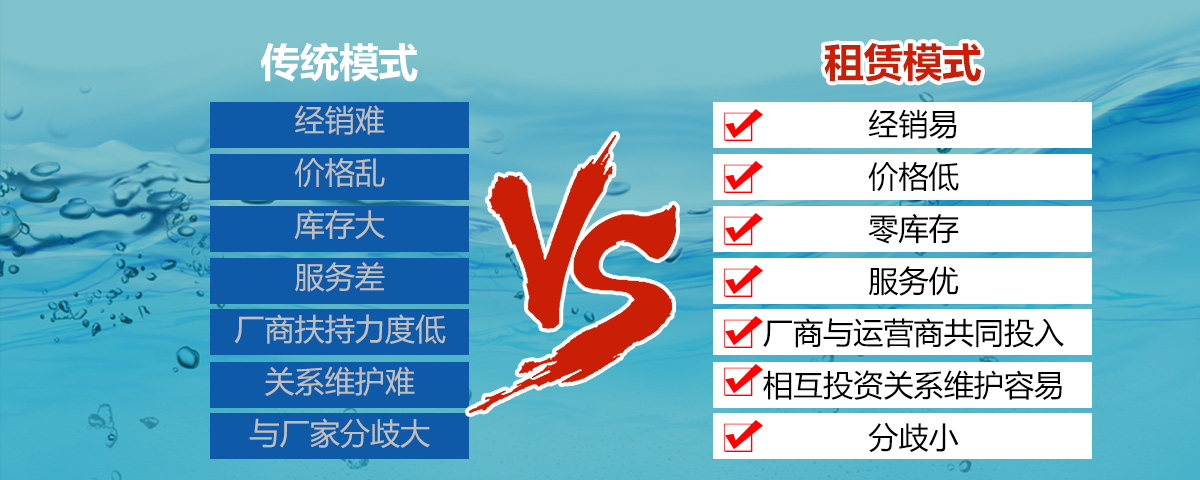 传统的营销模式无非就这几种:经销商模式、直销模式、会消模式、网销模式、展销模式等, 还有其他的传统营销模式我就不一一介绍了,就是因为传统,所以每个品牌都在利用这些模式在运作的同时导致千篇一律,在客户看来没有什么新意,本来在净水器产品外观就差不多,技术也都一样,要想突破,模式显的尤为重要,租赁模式是一种全新的免费智能服务模式,五免政策颠覆了传统的营销模式、进入门槛低、就有很强的消费增值、即使简单分享也能赚钱;您只需要成为我们的合作伙伴,成为我们的运营商,即可获得我们租赁系列产品的市场运营权,实现用户“0”元装机+“0”元更换配件+“0”元终身服务,运营商将通过租赁业务实现永久性利润分享;合作模式简单,平台厂商和运营商联合运营、共同投入、共担风险、贡献利润,收益比例高达50%-60%,运营商投资越多,收益就越高,0风险,可持续性永久收益;净水器租赁模式或许是下一个净水器行业的春天。