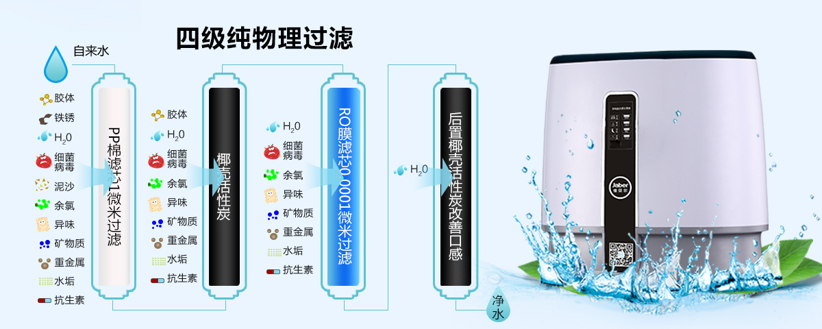 佳贝尔耗时三年的时间完成开发的复杂运算程序和连接接近完美的物联网连接技术,把传统的单纯净水过滤的净水器,转变成具有“云数据+智能+服务+净水过滤工艺”的复合型多维交互的智能净水器,彻底解决掉埋藏在用户心中使用净水器最深的 “痛点”;用户只需一台手机便可实现全部操作功能和显示功能,省去了蹲下按键的麻烦;除了这些便捷的智能功能外,其传统的过滤工艺依旧非常强大,搭载超强的四级物理过滤组合,即:“PP棉滤芯1微米过滤、椰壳活性炭、400加仑大通量RO反渗透滤芯,过滤精度0.0001微米、后置椰壳活性炭”,能有效的去除水垢、重金属、抗生素、细菌病毒、铁锈、泥沙、余氯、异味、胶体等,保证制水品质的健康和安全,而精湛工艺的400加仑大通量设计,具有划时代的净化新鲜活水能力,实时制出干净鲜活的净水,省去了储水罐槽可能导致的二次污染外,还节省了厨房大量的空间。